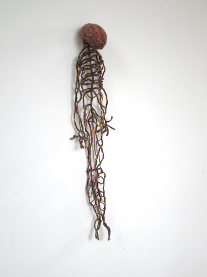 het ongelijkwaardige evenwicht tussen voelen en denken, tussen willen en weten 2012 wol vilt en haakwerk 49 x 14 x 5 cm.