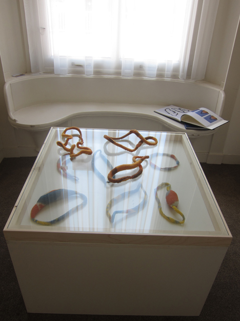 room with jewelry from 2014 - 2017 and a single related sculpture