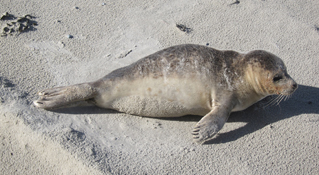 bij een smal stuk strand waar de kust afslaat, ligt een klein zeehondje